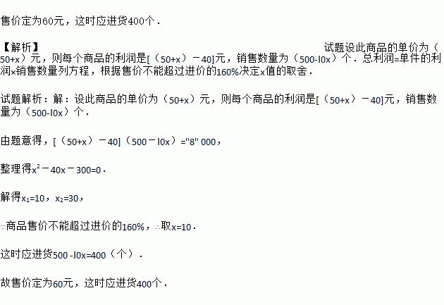 某超市如果将进货价为40元的商品按50元销售,就能卖出500个,但如果这种商品每个涨价1元,其销售量就减少10个,如果你是超市的经理,为了赚得8 000元的利润,你认为售价(售价不能超过进价的160%)应定为多少?这时应进货多少个?