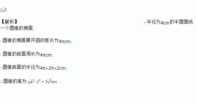 如图所示,把半径为4 cm的半圆围成一个圆锥的侧面,使半圆圆心为圆锥的顶点,那么这个圆锥的高是_______cm.(结果保留根号)