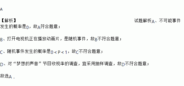 A. 不可能事件发生的概率是0 B. 打开电视机正在播放动画片,是必然事件