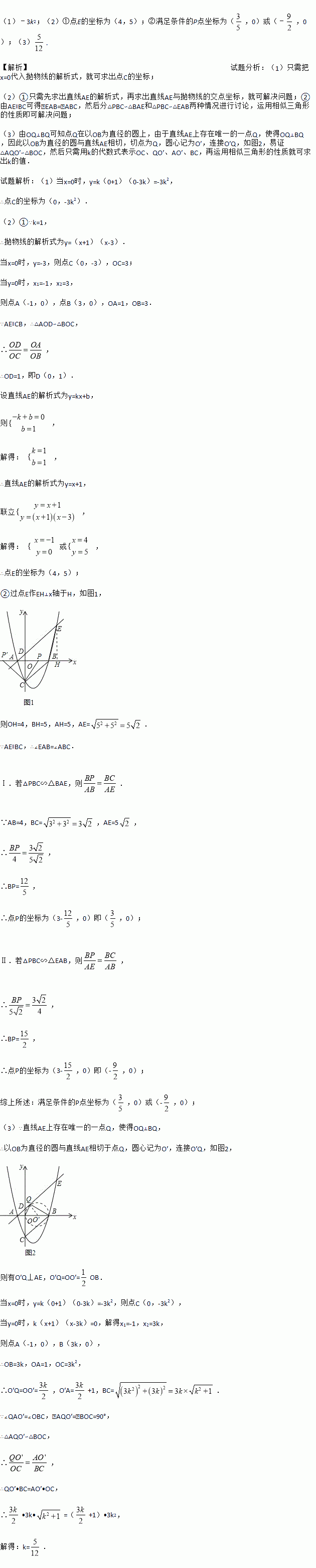 如图,己知抛物线y=k(x+1)(x﹣3k)(且k>0)与x轴分别交于A、B两点,A点在B点左边,与Y轴交于C点,连接BC,过A点作AE∥CB交抛物线于E点,O为坐标原点.
