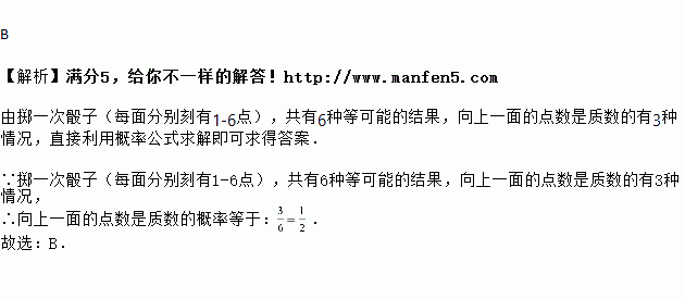 掷一次骰子(每面分别刻有点),向上一面的点数是质数的概率等于( )
