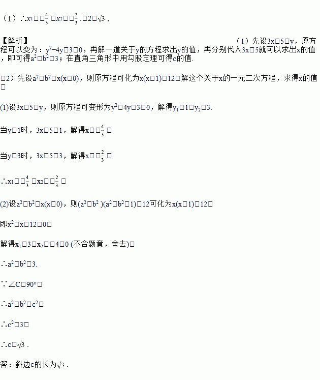 (2)ÔÚ¡÷ABCÖУ¬¡ÏC£½90¡ã£¬Á½ÌõÖ±½Ç±ßµÄ³¤·Ö±ðΪa£¬b£¬Ð±±ßµÄ³¤Îªc£¬ÇÒ(a2£«b2)(a2£«b2£«1)£½12£¬Çóб±ßcµÄ³¤£®