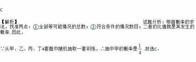 2014年3月,YC市举办了首届中学生汉字听写大会,从甲、乙、丙、丁4套题中随机抽取一套训练,抽中甲的概率是( )