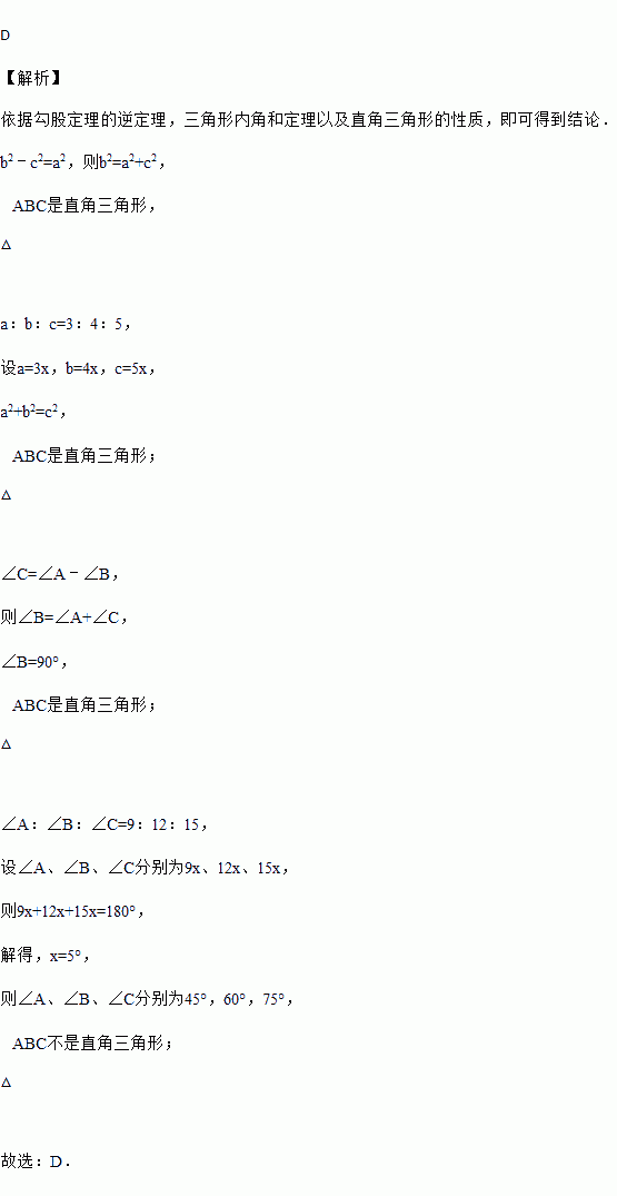 C. ∠C=∠A﹣∠B D. ∠A:∠B:∠C=9:12:15