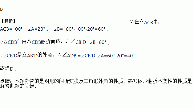 如图,在△ACB中,∠ACB=100°,∠A=20°,D是AB上一点.将△ABC沿CD折叠,使B点落在AC边上的B′处,则∠ADB′等于( )