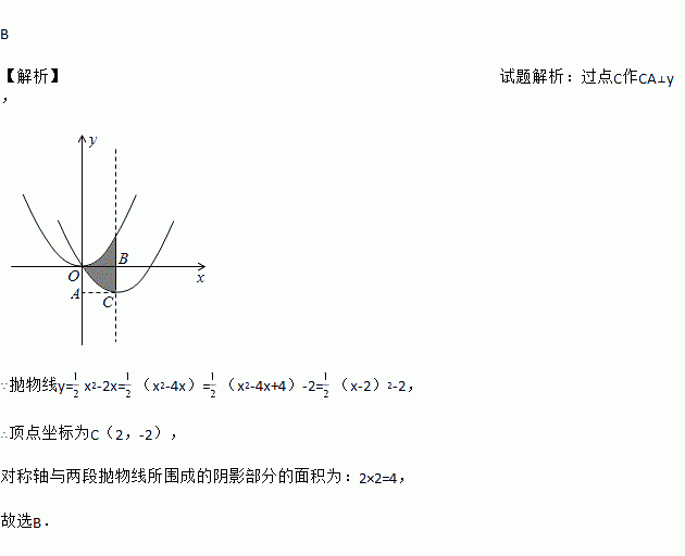 B 【解析】试题解析:过点C作CA⊥y, ∵抛物线y=x2-2x=(x2-4x)=(x2-4x+4)-2=(x-2)2-2, ∴顶点坐标为C(2,-2), 对称轴与两段抛物线所围成的阴影部分的面积为:2×2=4, 故选B.