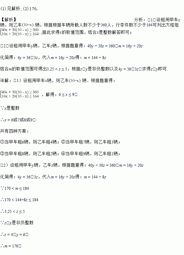 (1)已知师生行李打包后共有164件,若租用10辆甲、乙两种型号的客车,请你帮助设计出该校所有可行的租车方案;