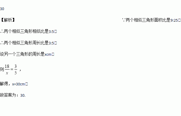 两个相似三角形面积比是9:25,其中较小一个三角形的周长为18cm,则另一个三角形的周长是___cm.