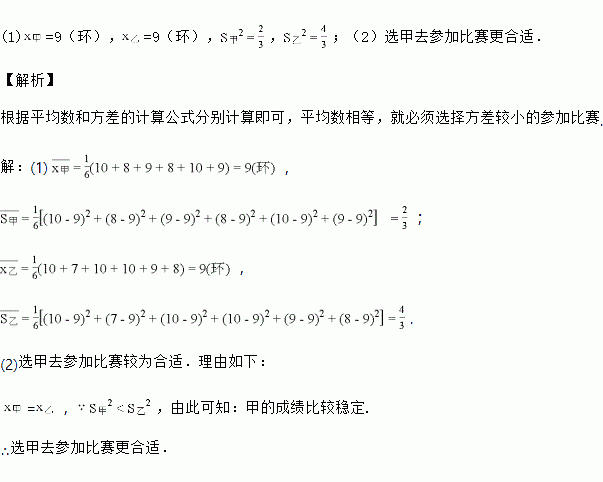某射击队要从甲、乙两名运动员中选拔一人参加比赛,现对他们进行了六次测试,测试成绩如下表(单位:环).