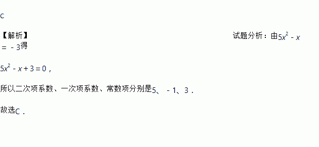C 【解析】试题分析:由5x2-x=-3得 5x2-x+3=0, 所以二次项系数、一次项系数、常数项分别是5、-1、3. 故选C.