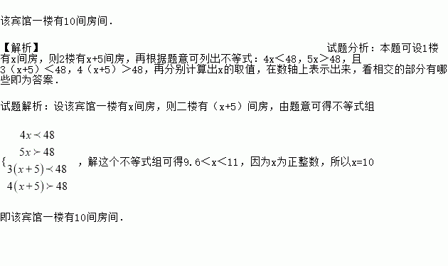 北京奥运会期间,某旅行社组团去北京观看某场足球比赛,入住某宾馆.已知该宾馆一楼房间比二楼房间少5间,该旅游团有48人,若全部安排在一楼,每间住4人,房间不够,每间住5人,有房间没住满.若全部安排在二楼,每间住3人,房间不够,每间住4人,则有房间没住满.你能根据以上信息确定宾馆一楼有多少房间吗?