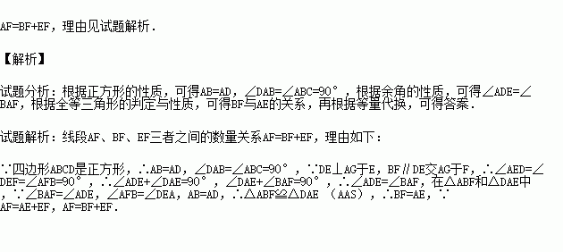 如图,在正方形ABCD中,G是BC上任意一点,连接AG,DE⊥AG于E,BF∥DE交AG于F,探究线段AF、BF、EF三者之间的数量关系,并说明理由.