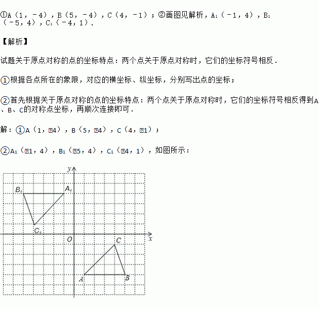 ②以原点O为对称中心,画出△ABC关于原点O对称的△A1B1C1,并写出A1、B1、C1的坐标.