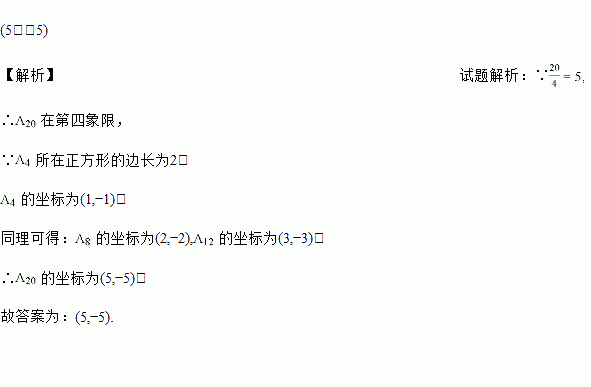如图,正方形A1A2A3A4,正方形A5A6A7A8,正方形A9A10A11A12,…(每个正方形从第三象限的顶点开始,按顺时针方向顺序,依次记为A1,A2,A3,A4;A5,A6,A7,A8;A9,A10,A11,A12;…)的中心均在坐标原点O,各边均与x轴或y轴平行.若它们的边长依次是2,4,6,…,则顶点A20的坐标为_____________.