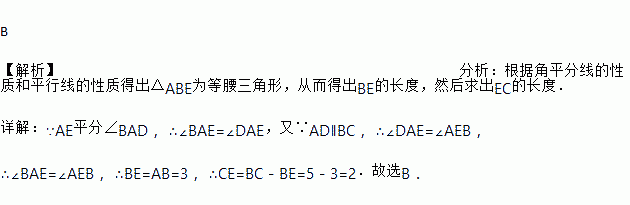 如图,在□ABCD中,AD=5,AB=3,AE平分∠BAD交BC边于点E.则线段CE的长度为( )