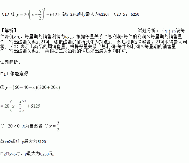 (1)①②x=2或3时y最大为6120;(2)5, 6250 【解析】试题分析:(1)①设每件降价x元,每星期的销售利润为y元,根据等量关系“总利润=每件的利润×每星期的销售量”,写出函数关系式即可;②把函数的解析式化为顶点式,然后根据x取整数,即可求得最大利润;(2)表示出商品的周销售量,根据等量关系“总利润=每件的利润×每星期的销售量”,写出函数关系式,再根据二次函数的性质求出最大利润即...