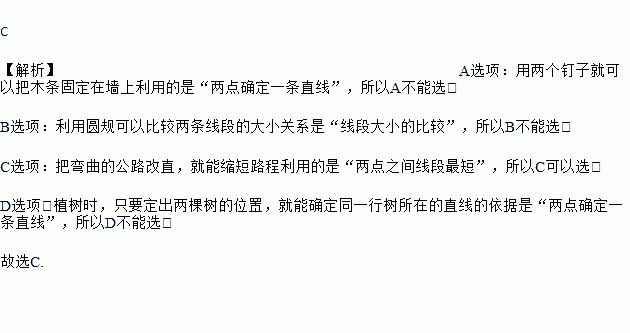 C 【解析】A选项:用两个钉子就可以把木条固定在墙上利用的是“两点确定一条直线”,所以A不能选; B选项:利用圆规可以比较两条线段的大小关系是“线段大小的比较”,所以B不能选; C选项:把弯曲的公路改直,就能缩短路程利用的是“两点之间线段最短”,所以C可以选; D选项:植树时,只要定出两棵树的位置,就能确定同一行树所在的直线的依据是“两点确定一条直线”,所以D不能选; ...