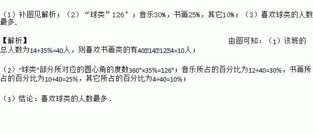 (2)在图2中,求出“球类”部分所对应的圆心角的度数,并分别写出爱好“音乐”、“书画”、“其它”的人数占本班学生数的百分数;