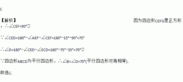 如图,有一平行四边形ABCD与一正方形CEFG,其中E点在AD上.若∠ECD=35°,∠AEF=15°,则∠B的度数为何?( )