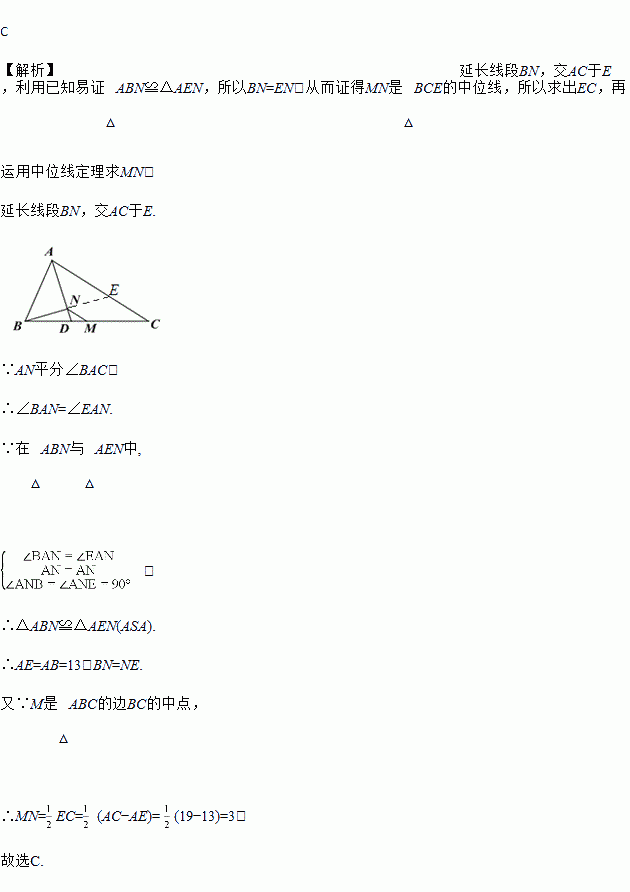 如图,AD是△ABC的角平分线,M是BC的中点,BN⊥AD于N,若AB=13,AC=19,则MN=( )