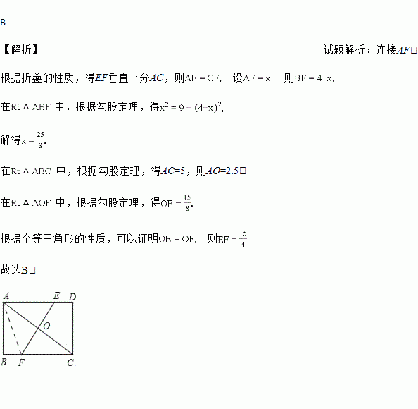 如图,在长方形ABCD中,AB=3,BC=4,若沿折痕EF折叠,使点C与点A重合,则折痕EF的长为( )