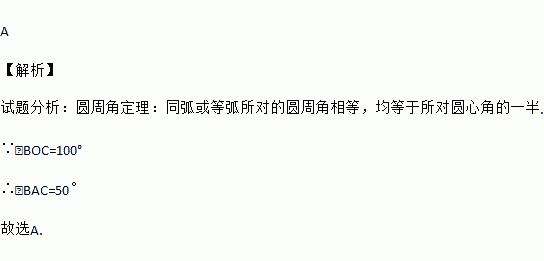 如图,已知圆心角∠BOC=100°,则圆周角∠BAC的度数是( )