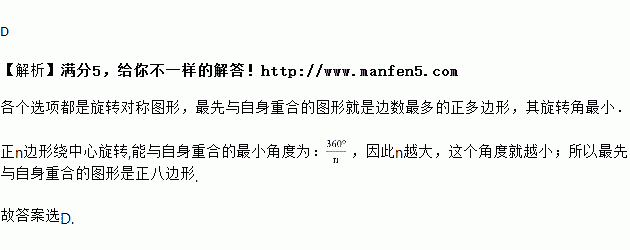 下列各图形绕着各自中心旋转一定的角度能与自身重合,若各图以相同的旋转速度同时旋转,则最先与自身重合的图形是( )