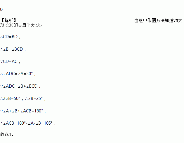 D 【解析】由题中作图方法知道MN为线段BC的垂直平分线, ∴CD=BD, ∴∠B=∠BCD, ∵CD=AC, ∴∠ADC=∠A=50°, ∵∠ADC=∠B+∠BCD, ∴2∠B=50°,∴∠B=25°, ∵∠A+∠B+∠ACB=180°, ∴∠ACB=180°-∠A-∠B=105°, 故选D.如图,在△ABC中,AB=AC,D为BC上一点,且DA=DC,BD=BA,则∠B的大小为