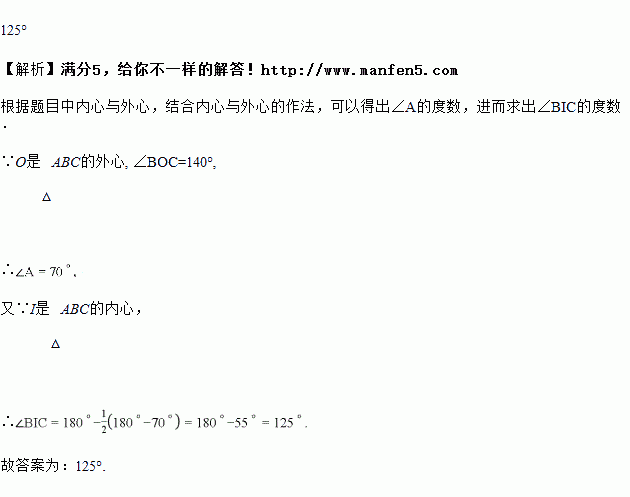 如图,在ΔABC中,∠BOC=140°,I是内心,O是外心,则∠BIC=_______.