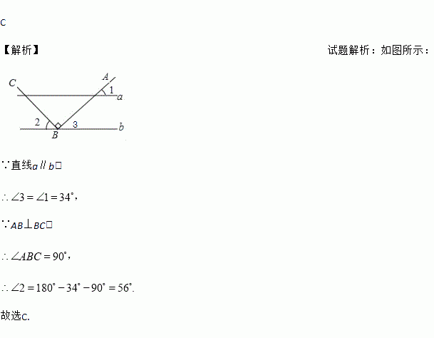如图,a∥b,点B在直线b上,且AB⊥BC,若∠1=34°,则∠2的大小为( )