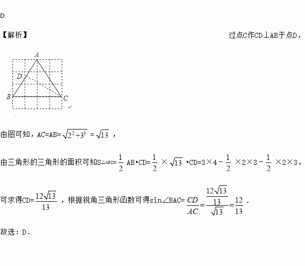 正方形网格中,△ABC如图放置,则sin∠BAC=( )