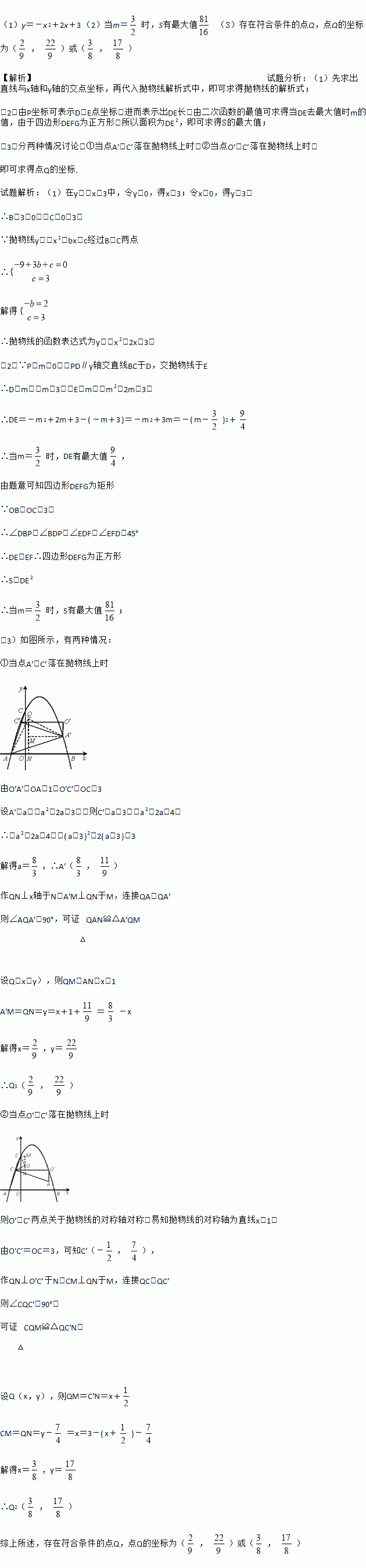 (3)在坐标平面内是否存在点Q,将△OAC绕点Q逆时针旋转90°,使得旋转后的三角形恰好有两个顶点落在抛物线上.若存在,求出所有符合条件的点Q的坐标;若不存在,请说明理由.