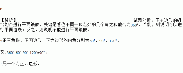 一幅美丽的图案,在其顶点处由四个正多边形镶嵌而成,其中三个分别为正三角形、正四边形、正六边形,则另一个为( )
