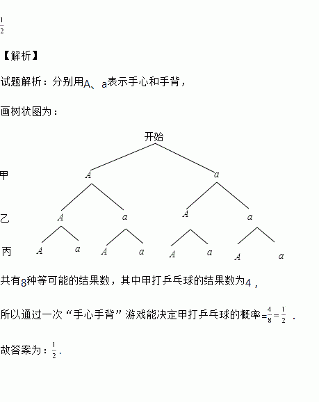 甲、乙、丙三位同学打乒乓球,想通过“手心手背”游戏来决定其中哪两人先打.规则如下:三人同时各用一只手随机出示手心或手背,若只有两人手势相同(都是手心或都是手背),则这两人先打;若三人手势相同,则重新决定.那么通过一次“手心手背”游戏能决定甲打乒乓球的概率是_________.