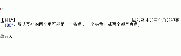D 【解析】因为互补的两个角的和等于180°,所以互补的两个角可能是一个锐角,一个钝角;或两个都是直角. 故选D.