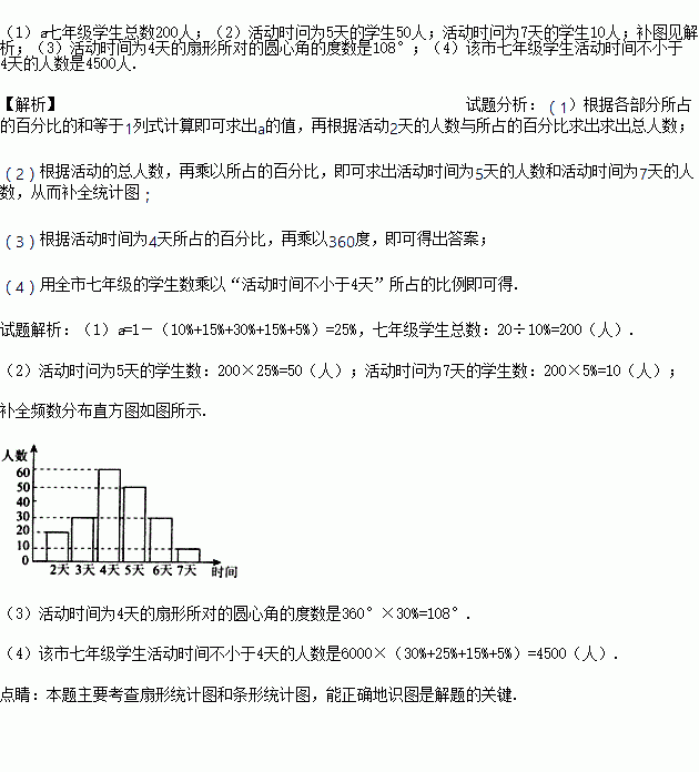 (4)如果该市共有七年级学生6000人,请你估计“活动时间不小于4天”的大约有多少人?