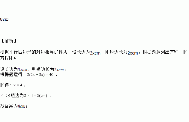 用40cm长的绳子围成一个平行四边形,使其相邻两边的长度比为3:2,则较短边的长度为______