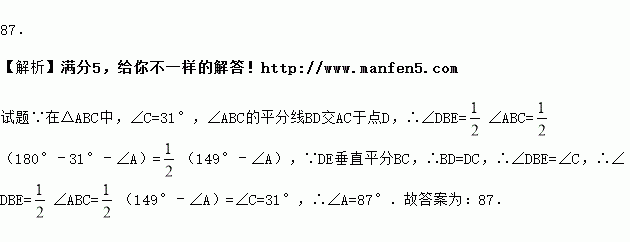 (3分)如图,在△ABC中,∠C=31°,∠ABC的平分线BD交AC于点D,如果DE垂直平分BC,那么∠A= °.
