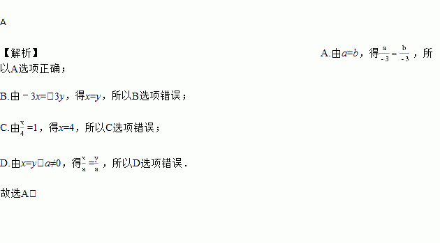 A. 由a=b,得 B. 由﹣3x=﹣3y,得x=﹣y