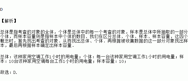 为了了解某种家用空调工作l小时的用电量,调查10台该种空调每台工作l小时的用电量,在这个问题中总体是( )