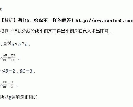 如图,直线a,b,c分别与直线m,n交于点A,B,C,D,E,F,直线a∥b∥c,若AB=2,BC=3,则 的值为( )