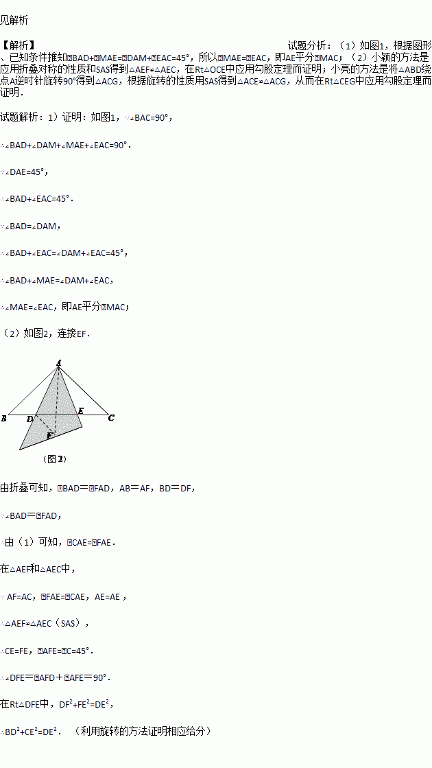 (2)当0°<α≤45°时,小敏在旋转中还发现线段BD、CE、DE之间存在如下等量关系:BD2+CE2=DE2.同组的小颖和小亮随后想出了相同的方法进行解决:将△ABD沿AD所在的直线对折得到△ADF(如图2);请证明小敏的发现的是正确的.
