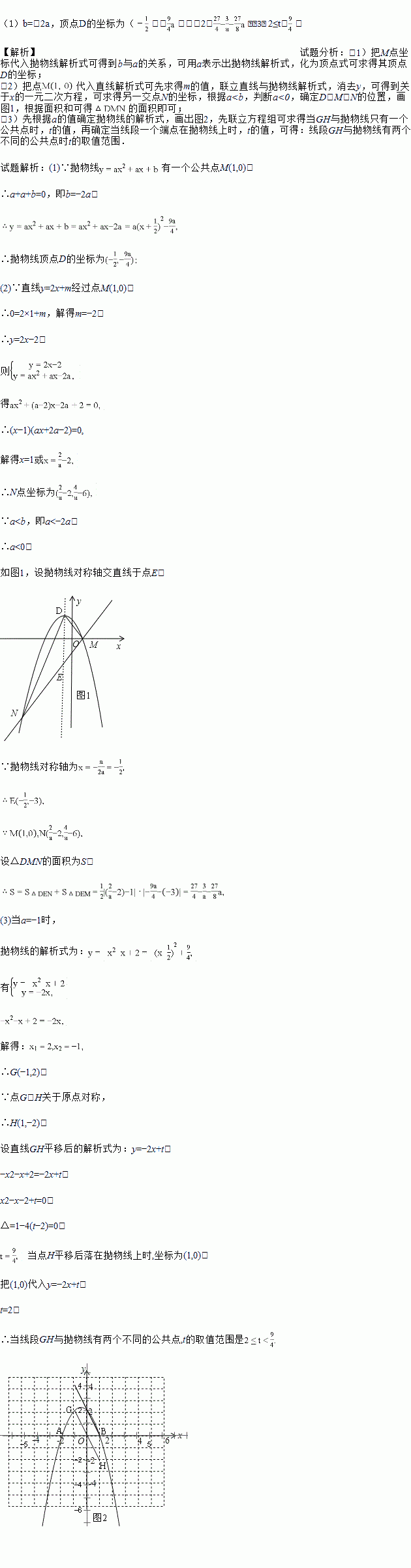 已知,抛物线y=ax2+ax+b(a≠0)与直线y=2x+m有一个公共点M(1,0),且a<b.