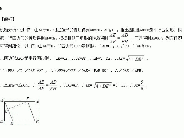 如图,矩形ABCD中,AD=2,AB=3,过点A,C作相距为2的平行线段AE,CF,分别交CD,AB于点E,F,则DE的长是( )
