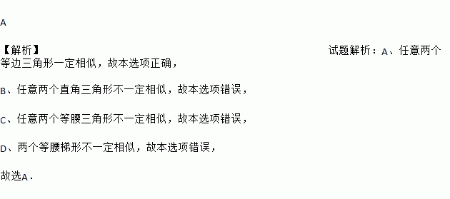 A 【解析】试题解析:A、任意两个等边三角形一定相似,故本选项正确, B、任意两个直角三角形不一定相似,故本选项错误, C、任意两个等腰三角形不一定相似,故本选项错误, D、两个等腰梯形不一定相似,故本选项错误, 故选A.