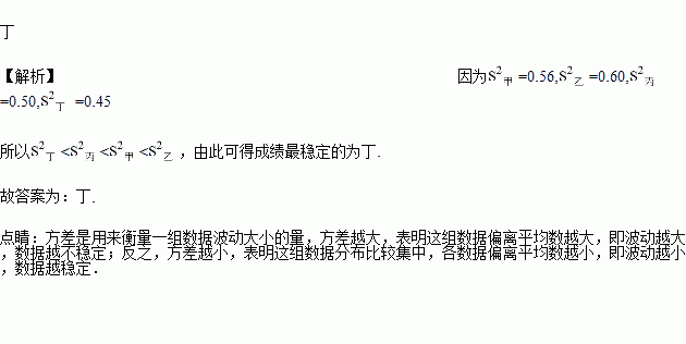 甲、乙、丙、丁四人进行射击测试,每人10次射击成绩的平均数均是9.2环,方差分别为,,,,则成绩最稳定的是_________.