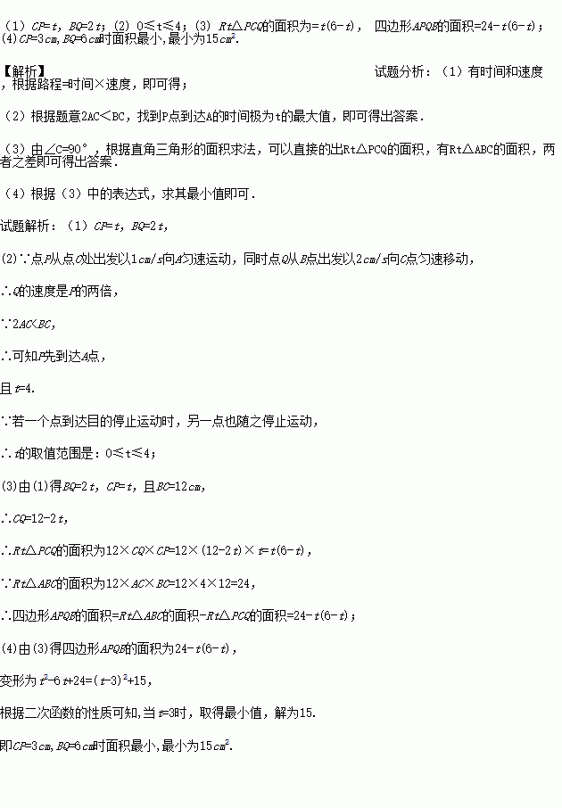 如图,在Rt△ABC中,∠C=90°,AC=4cm, BC=12cm.点P从点C处出发以1cm/s向A匀速运动,同时点Q从B点出发以2cm/s向C点匀速移动,若一个点到达目的停止运动时,另一点也随之停止运动.运动时间为t秒;