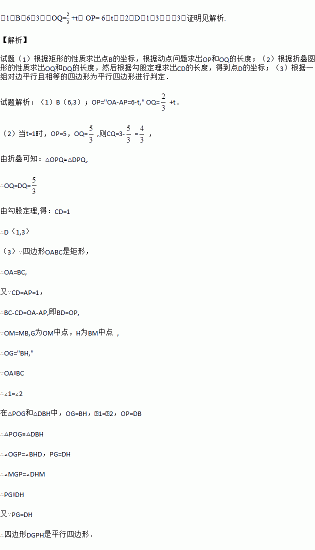(3)在(2)的条件下,矩形对角线AC,BO交于M,取OM中点G,BM中点H,求证:当t=1时四边形DGPH是平行四边形.