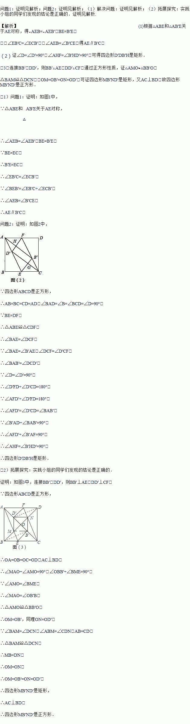 问题2:如图(2),若点E,点F分别为边BC,边AD的中点,沿AE、CF将正方形纸片ABCD折叠,点B的对应点为B′,点D的对应点D′,D′F与AB′交于点H,B′E与CD′交于点G,求证:四边形D′GB′H为矩形.