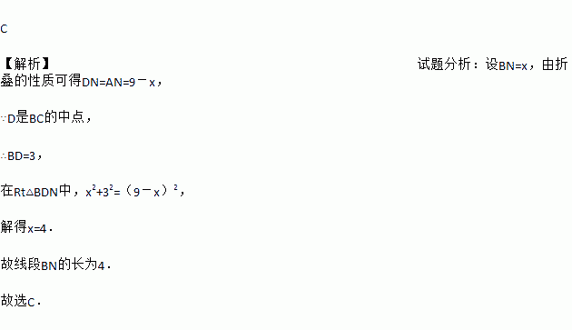 如图,Rt△ABC中,AB=9,BC=6,∠B=90°,将△ABC折叠,使A点与BC的中点D重合,折痕为MN,则线段BN的长为( )